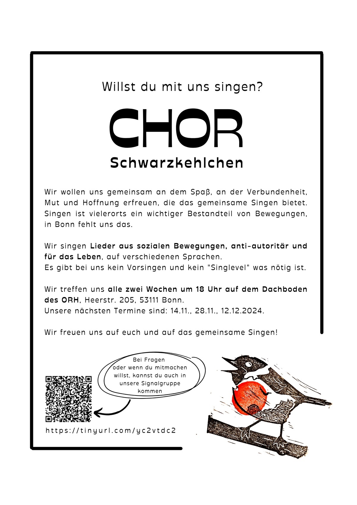 Wir treffen uns alle zwei Wochen donnerstags um 18 Uhr mit unserem Chor - den Schwarzkehlchen - auf dem Dachboden des ORH um gemeinsam zu singen. Unsere nächsten Termine sind z.B. der 14.11. und der 28.11.24.