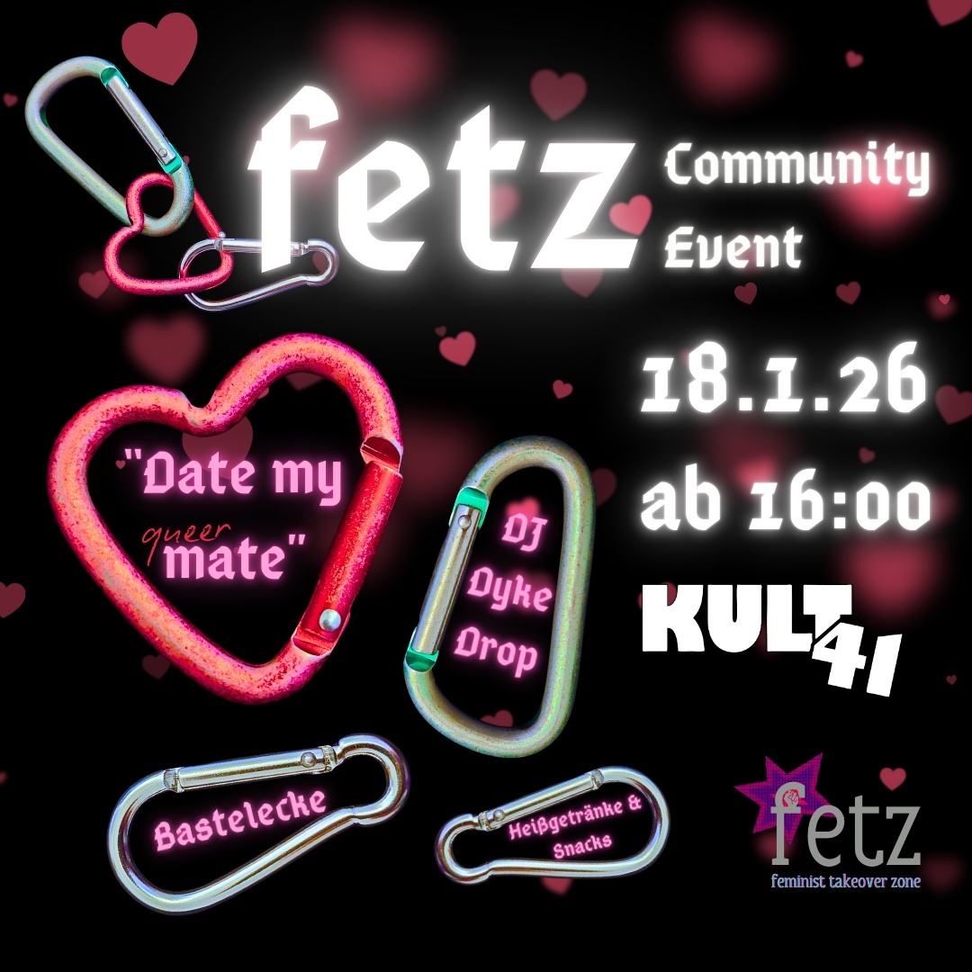Am 18.1.26 ab 16 Uhr übernehmen wir das Kult41 und laden euch ein, mit uns den Nachmittag zu verbringen. Es gibt musik von DJ Dykedrop💧, einen basteltisch, (heiß-)getränke, snacks und die möglichkeit, eure dateable freundis in einer präsentation vorzustellen und das nächste date für sie zu klären.