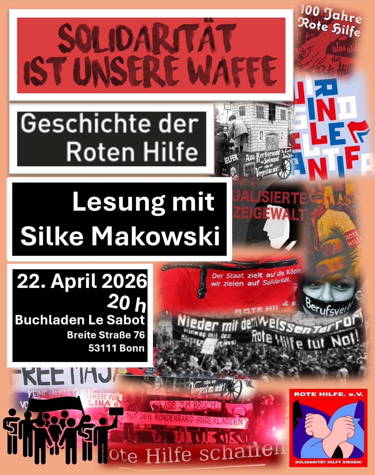 Der Eintritt ist frei. Veranstalter*innen: Buchladen Le Sabot, der Verein zur Förderung politischer und internationaler Literatur e.V. und die Ortsgruppe Bonn der Roten Hilfe e.V.