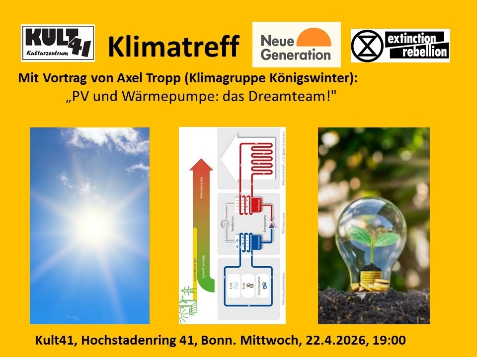 6. Klimatreff mit Vortrag von Axel Tropp (Klimagruppe Königwinter): “PV und Wärmepumpe: das Dreamteam!“. Mit viel Zeit für Diskussion, Information und praktische Beratung. Wie machen wir uns unabhängig von fossilen Brennstoffen? Kommt zahlreich, wir freuen uns auf Euch!