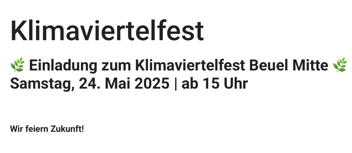 Ab 15 Uhr beginnt das Programm mit einer Musik-Theater-Performance des Theater Marabu, anschließend geht es ab 16 Uhr mit Mitmachaktionen, Infoständen, und kulinarischen Angebot weiter. Das Fest bietet Anregungen und Austausch rund um die Frage, wie ein klimafreundliches und lebenswertes Quartier gemeinsam gestaltet werden kann. Im Mittelpunkt stehen dabei die vielen engagierten Initiativen, die das Klimaviertel Beuel Mitte aktiv mitgestalten.