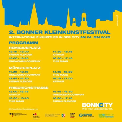 Bonner Kleinkunstfestival Saturday, May 24, 11:00 AM-06:00 PM Saturday 24 May 18:00 Friedrichstraße Friedrichstraße 34, 53111 Bonn ArtistikBonnFriedrichstraßeKleinkunstfestivalLive-ActsMagie